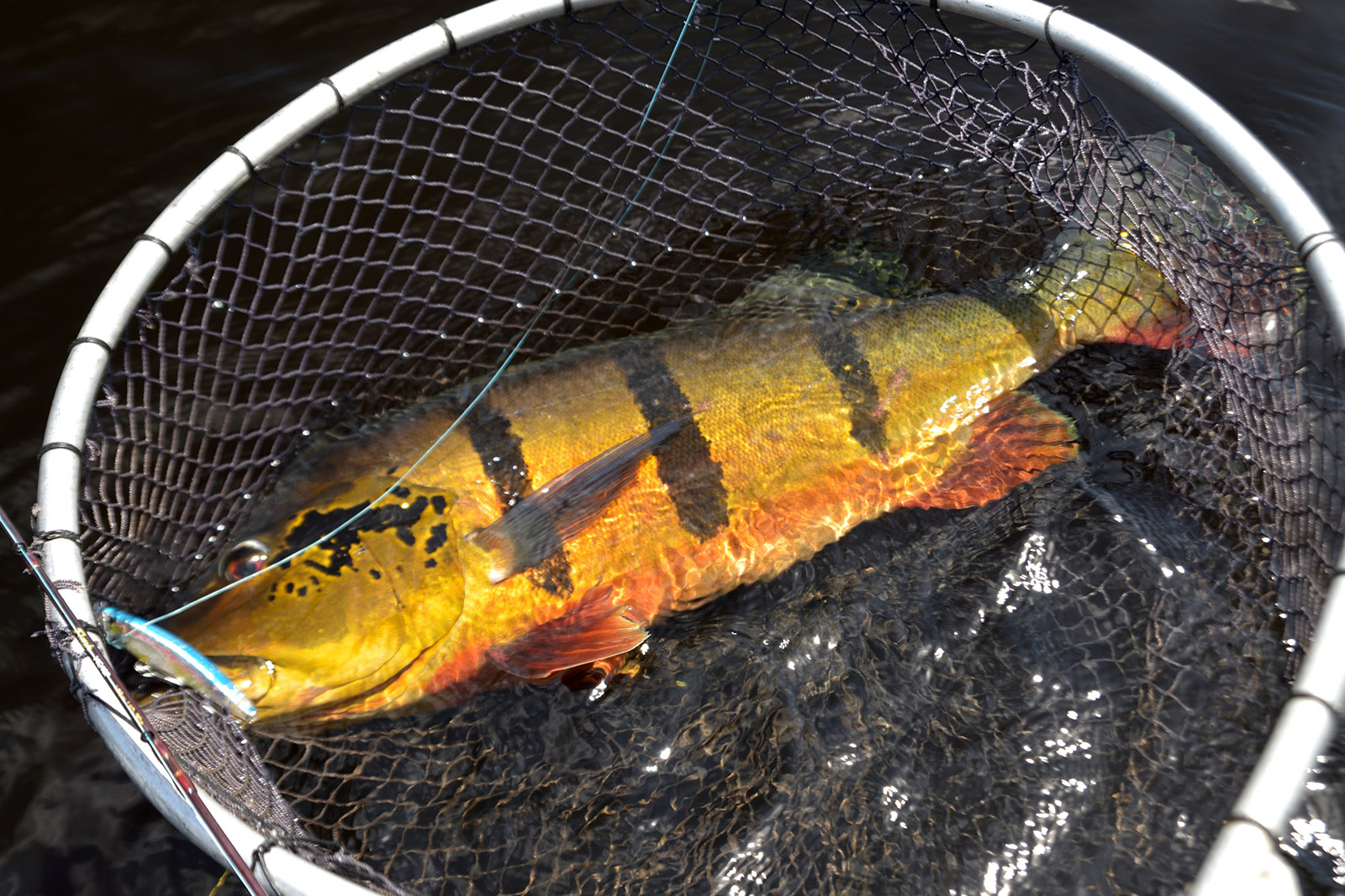 Tym razem los zdecydował jednak inaczej. Po raz pierwszy mierzyliśmy się z podwyższonym stanem rzeki, który piekielnie utrudniał łowienie. Z powodu ulewnych deszczy woda przybrała na nasz przyjazd ok. 100 cm. Wydaje się niewiele, ale w rzekach Amazonii ten 1 metr robi potrafi zrobić kolosalną różnicę. Podniesiona woda oznacza bowiem zalanie deszczowego lasu, który dochodzi do samych brzegów rzeki. To z kolei powoduje, że większość drobnicy wpływa głęboko między podtopione drzewa, a za nią oczywiście podążają wszystkie drapieżniki, z tucunare na czele. Efekt jest taki, że znaczna część ryb jest w ogóle niedostępna, już nie wspominając o możliwości ich łowienia. Zatopiona dżungla jest bowiem tak gęsta, iż wpłynięcie tam łodzią i oddanie rzutu jest kompletnie niemożliwe.