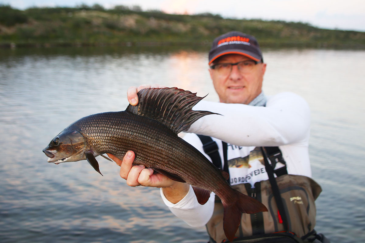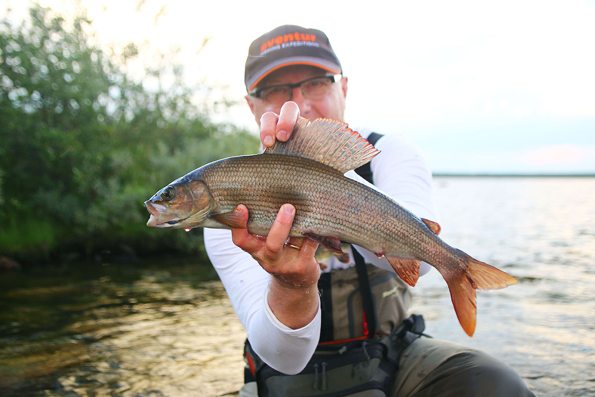 Jeziorowe łowy na spinning, trolling i sztuczną muchę przyniosły nam znacznie lepsze wyniki, niż rzeczne. Padło wiele pięknych lipieni, okoni i szczupaków – a największy z nich przekroczył magiczny metr. Na kamienistych rafach lipienie przekraczające 40 centymetrów brały jak szalone, w innych miejscach do naszych przynęt dobierały się okonie – każdy powyżej 30 centymetrów. Całość dopełniały przepiękne widoki, białe noce, cisza i spokój.