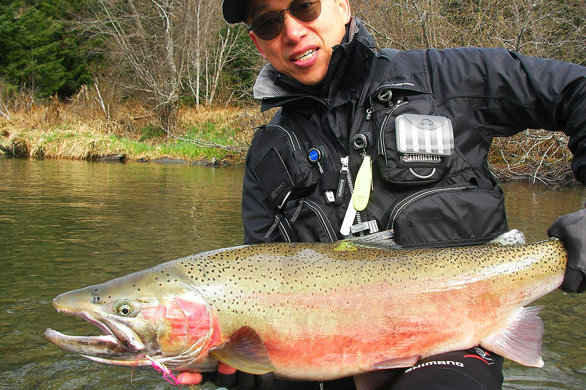 Po godzinie Staszek obudził się, wstał z pewną miną i rzekł: „No dobra ryboki, widzę, że tu źle się dzieje!”. Po czym wziął wędkę, wszedł raźnym krokiem do rzeki i w piątym może rzucie wielkim pomarańczowo-srebrnym blaszyskiem w nurt zaciął… Co? Oczywiście steelheada! Szczęki nam opadły ze zdumienia, bo to był pierwszy steelhead złowiony tutaj przez naszą grupę na spinning. A Staszek? Staszek z całkowitym spokojem wyholował rybę, z gracją skierował ją do nadstawionego przez przewodnika podbieraka i skwitował to wszystko donośnym „No!”.