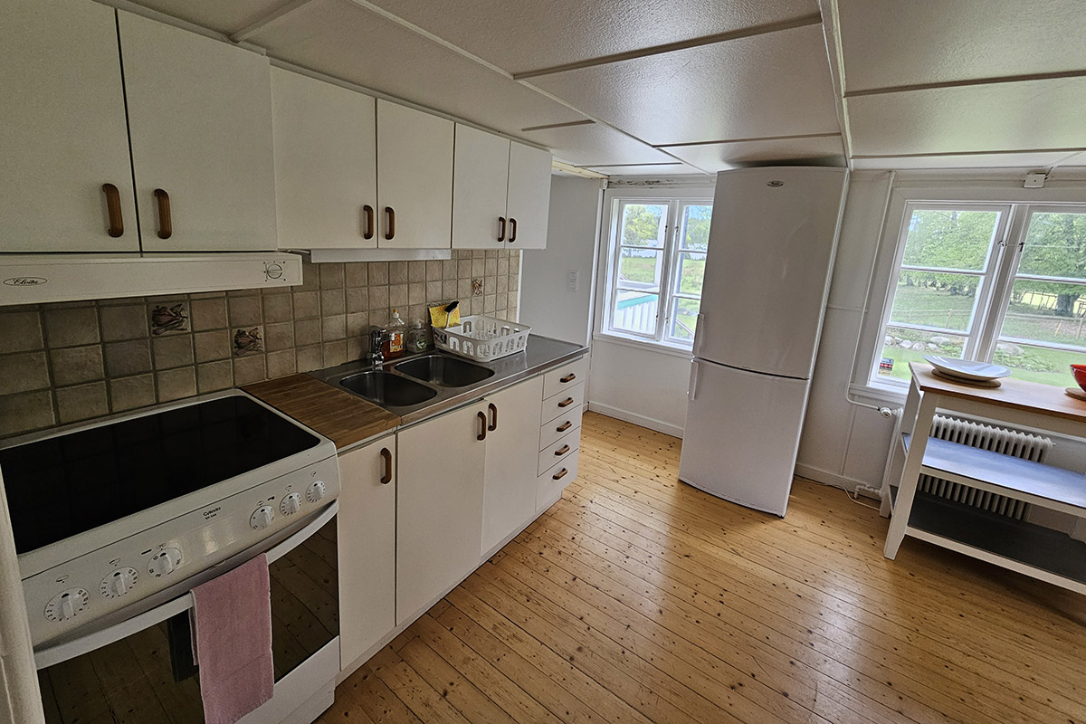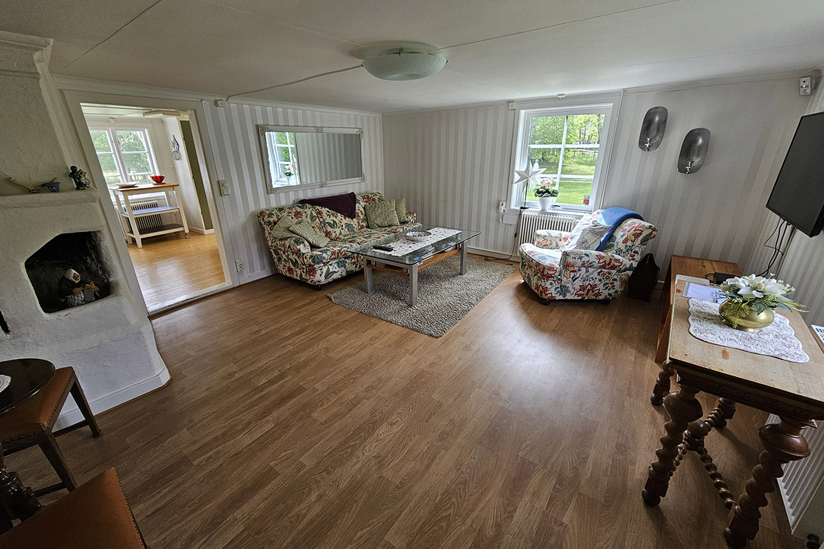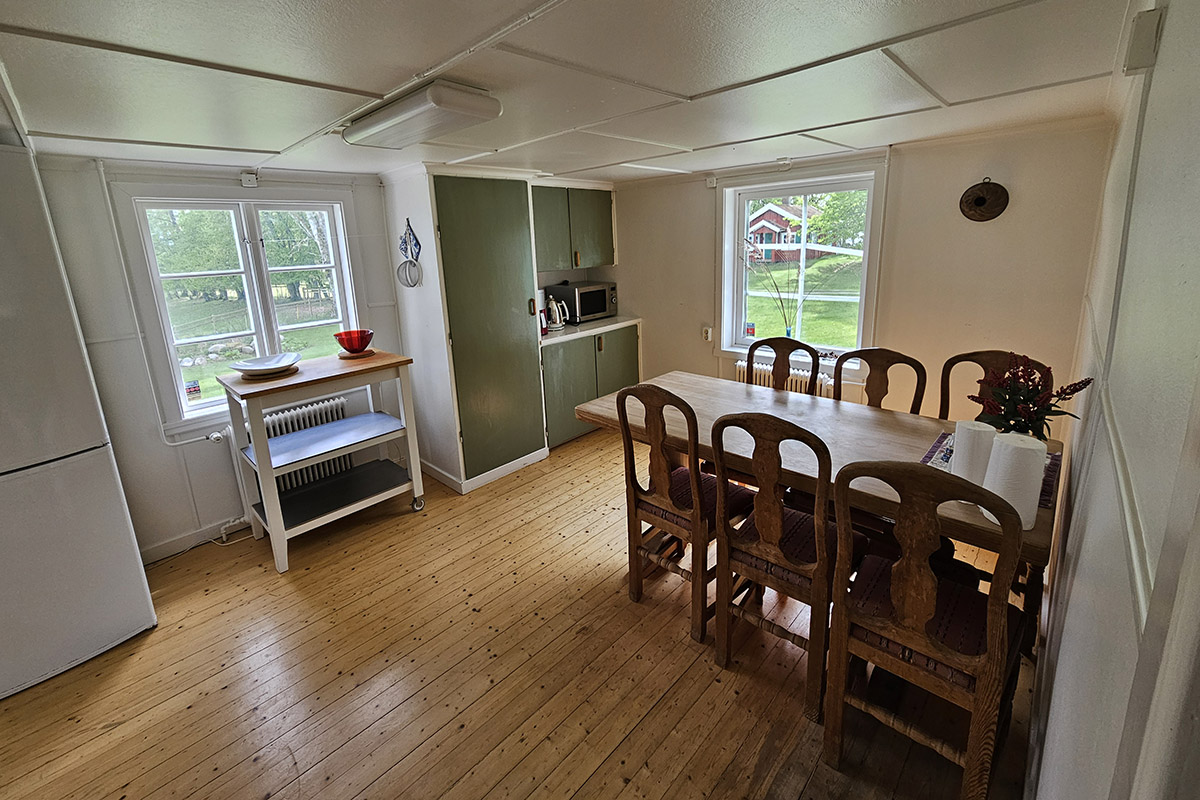 Do Państwa dyspozycji oddajemy klasyczny, stary szwedzki dom (parter) dla 4-6 osób. Duży, przestrony, z 2 sypialniami (przechodnie), w pełni wyposażoną kuchnią z częścią jadalnianą, świeżo odnowiona łazienka z prysznicem i WC oraz spory salon. Ważne, sufit w domku jest dość nisko, nie wszędzie właścicielowi udało się go podnieść podczas remontu. Najniżej jest w kuchni, osoby o wzroście 190 cm będą ocierały czupryną.